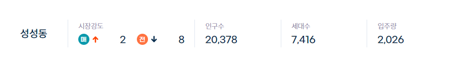 올해 초 0으로 상승을 하면서 성성동이 84타입 4억원 초반에서부터 중반까지 큰 상승이 나타났었던 것이 기억이 나네요. 시장강도는 부동산 시장을 바라보는 선제지표라고 알려져 있는데요. 이런 상황이라면 다른 어떤 지역보다 성성동 아파트 가격의 상승이 일어날 수 있겠네요.