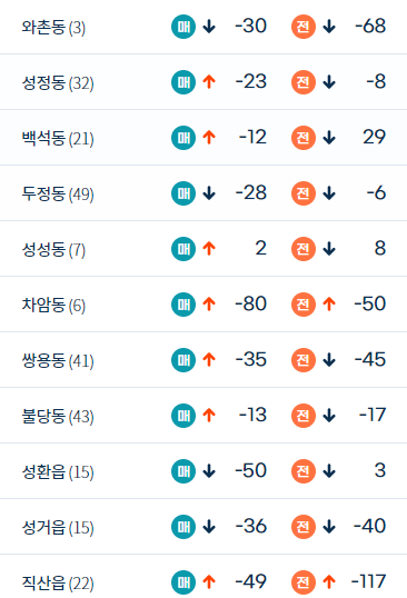 최근 천안에서는 성성동이 0에서 +으로 전환이 되면서 시장강도가 상승하고 있는 것을 볼 수 있습니다. 아래 표를 보면 확인이 되는데요. 성성동 +2, 백석동 -12, 불당동 -13 으로 보여지고 있습니다. 음의 숫자의 시장강도가 표현되어 있지만 0으로 상승을 하게 되면 조금더 상승하게 되는 것이 시장강도의 일반적인 모습입니다. 아래 이미지를 클릭하면 크게 볼 수 있으니 참고하세요.