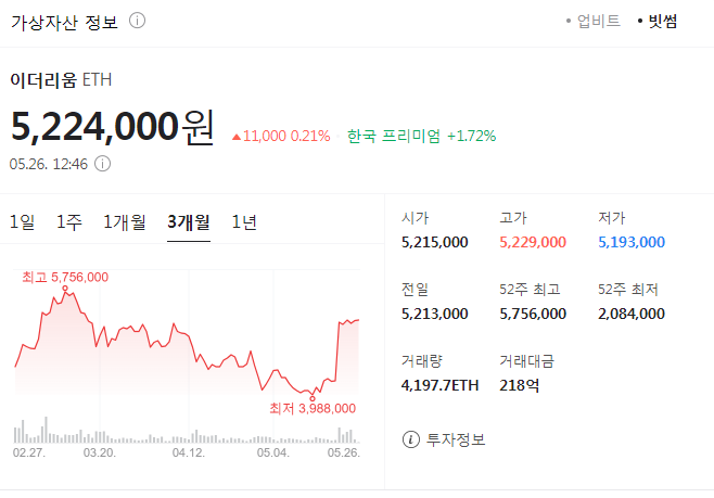 5월 중순만 하더라도 400만원 이하로 떨어졌었던 이더리움 시세는 5월 26일 12:46 현재 522만원을 넘어섰습니다. 크게 달라진 것은 일주일 전과 한국 프리미엄이 1% 넘게 상승을 했다는 것도 볼 수 있습니다. 비트코인 ETF 승인에 이어 4개월여만에 자산운용사 각각의 ETF 거래 승인은 남아있는 상태입니다. 알트코인으로는 처음입니다. 비트코인 ETF 승인 당시 거래가 시작된 이후 불과 2개월 만인 앞서 3월에 기존 최고가 1억원을 훌쩍 경신하기도 했습니다. 앞으로 ETF의 운명은? 이더리움 ETF 승인에 증권가에서는 “차기 투자처로 유망”하다고 밝힌바 있습니다.