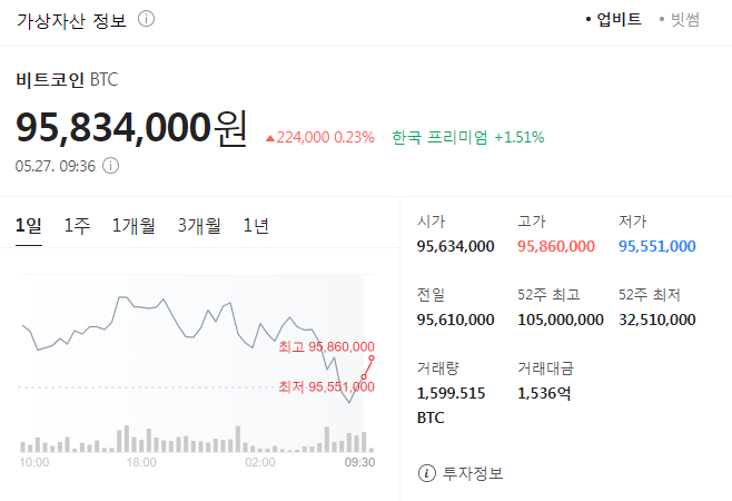 5.27 09:36 현재 시세는 상승으로 시작했습니다. 다만 10일 전과는 달리 김치프리미엄이라고 부르는 한국 프리미엄이 1.51% 으로 치솟았네요. 이것을 무엇을 의미하는 것일까요? 로버트 기요사키의 말을 몇년 전부터 실행했다면 부자가 되었있었을 텐데 미래에 대한 확신이 없는 것이 모든 사람들의 생각이 아닐까 생각해봅니다.