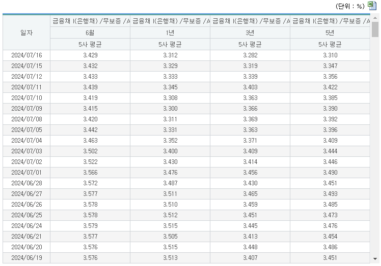 코픽스에 영향을 받는 금융채 AAA 6개월, 예금금리에 영향을 받는 금융채 AAA 1년, 고정금리에 영향을 받는 은행채 AAA 3년물, 역시 시장 금리가 많이 떨어져 있어보입니다. 이제 앞자리도 바뀌었네요. 3.2%...기준금리 보다 더 0.218% 내려가 있습니다. 향후 금리인하에 배팅을 하고 있는 것이죠. 미국은 9월에 내릴 것을 사실상 확정한다는 의미의 언론 보도가 많이 내려왔다고 보여집니다. 많게는 3회, 적게는 2회 인하를 말하고 있으니 우리나라 기준금리도 2회만 내려도 3.5% 에서 3%으로 내려가겠네요.. 어느정도 선반영 된 것도 있지만 시장금리는 더욱 내려 갈 것으로 보여집니다.
