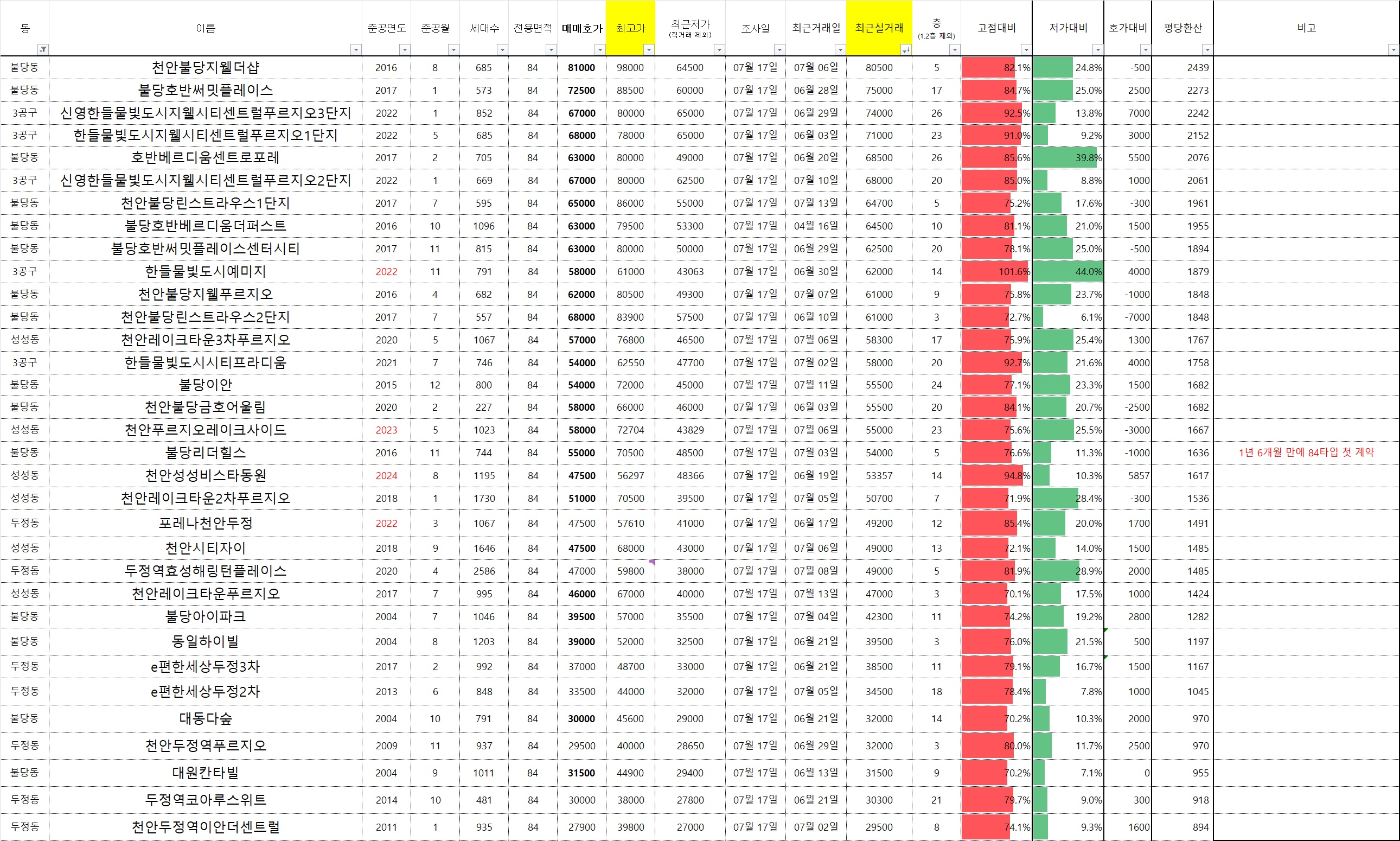 천안 아산 지역 주요 아파트 시세 실거래가(0717)