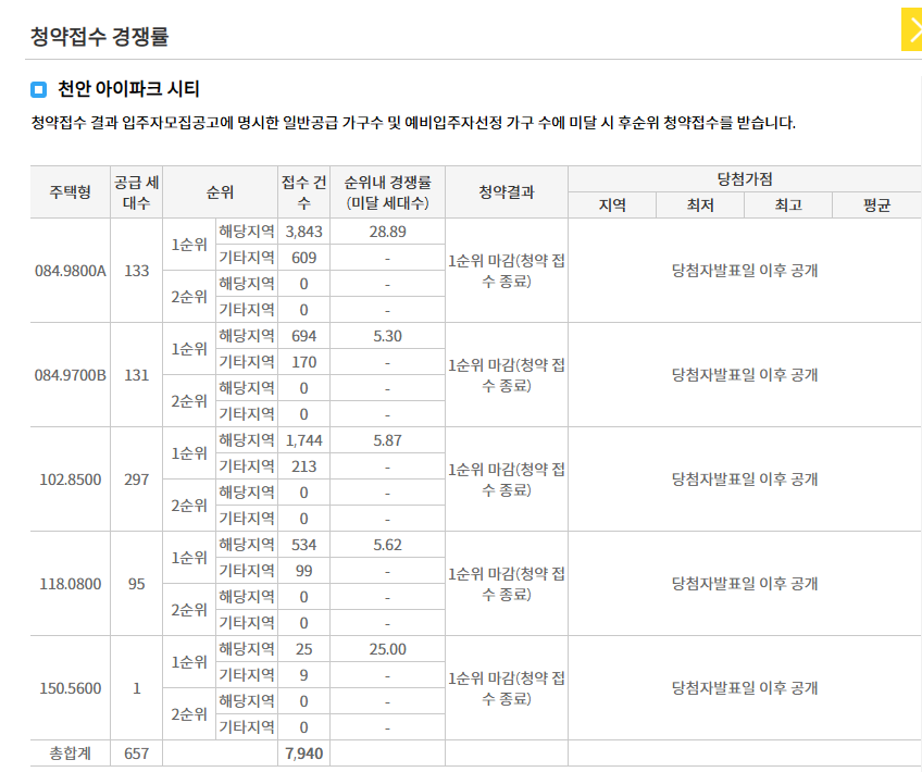 계약금 20% 납입을 해야하는 현재 성성지구 유일한 펜트하우스 150타입 1세대 모집에 천안 지역만 25개 + 기타지역 9건 포함 총 34건이 접수가 되었네요.