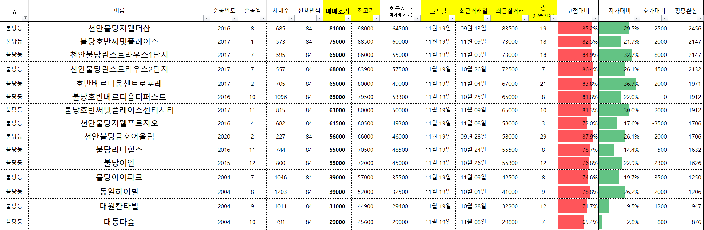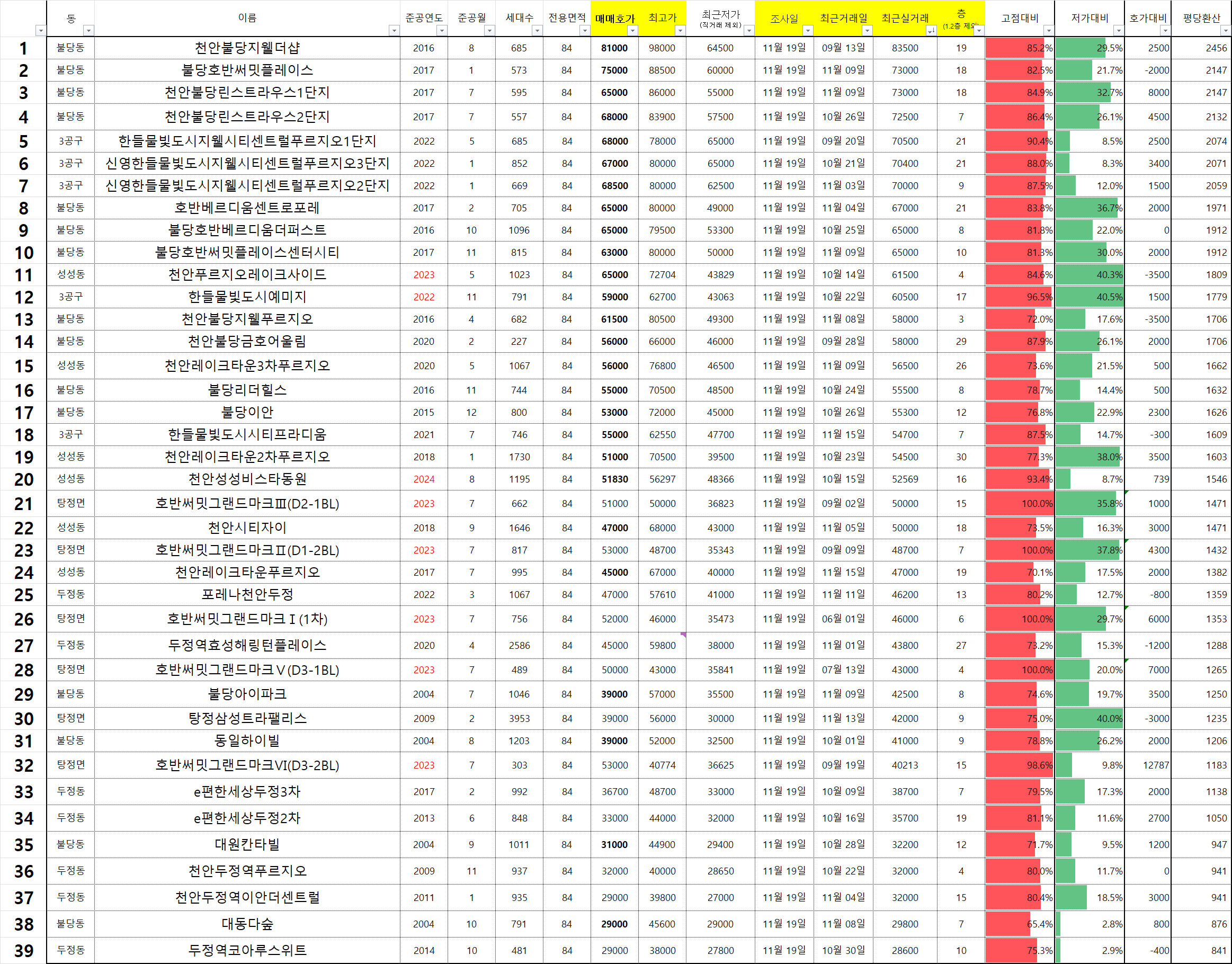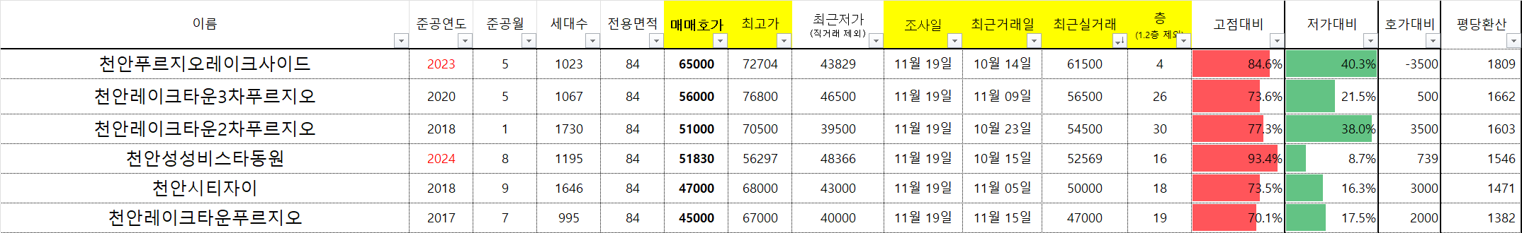 성성동에 자리 잡을 천안 아이파크 시티 아파트가 당첨자 발표를 하면서 오!? 분양가가 좀 쎈데? 라는 생각이 들어서 그 금액을 생각해보며 가격을 짚어봤습니다. 지금 청약 당첨자 발표 직후 초피에 거래가 된 경우도 있는 것 같습니다. 매수세가 매도세에 비해 약하다보니 당첨이 되지 않은 사람이라면 충분히 사볼만 한 가격대로 된 것 같습니다. 다시 본론으로 들어와서 천안과 아산의 주요 지역을 15일 단위로 조사를 하고 있는데 층마다 동마다 가격 차이가 예전보다 더 크게 느껴진다는 것입니다. 예를 들자면...아래로...
