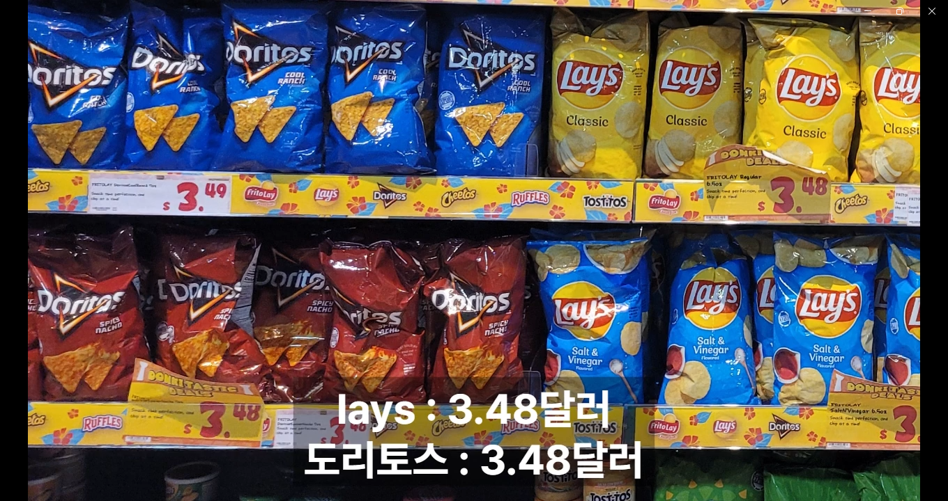 숙소에서 간식으로 먹을 만한 라는 과자가 3.48달러, 눈에 익은 과자 중 도리 토스도 같은 가격입니다.