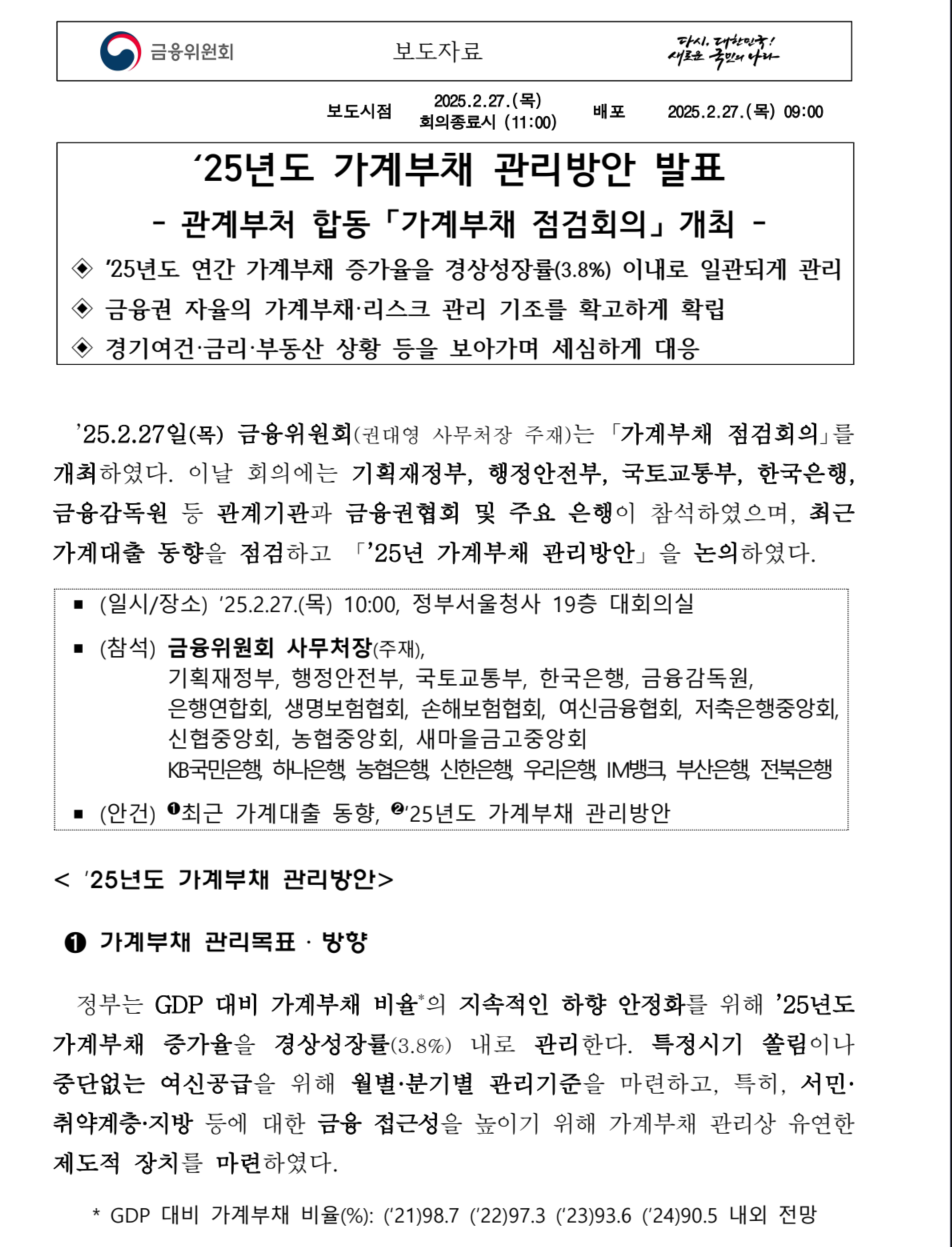 금융위원회는 2월 27일 가계부채 점검회의를 열고 올해 가계부채 증가율을 3.8% 이내로 유지하겠다고 발표했습니다. 이는 경상성장률과 비슷한 수준으로, 가계부채 증가를 엄격히 통제하려는 의도로 해석됩니다.