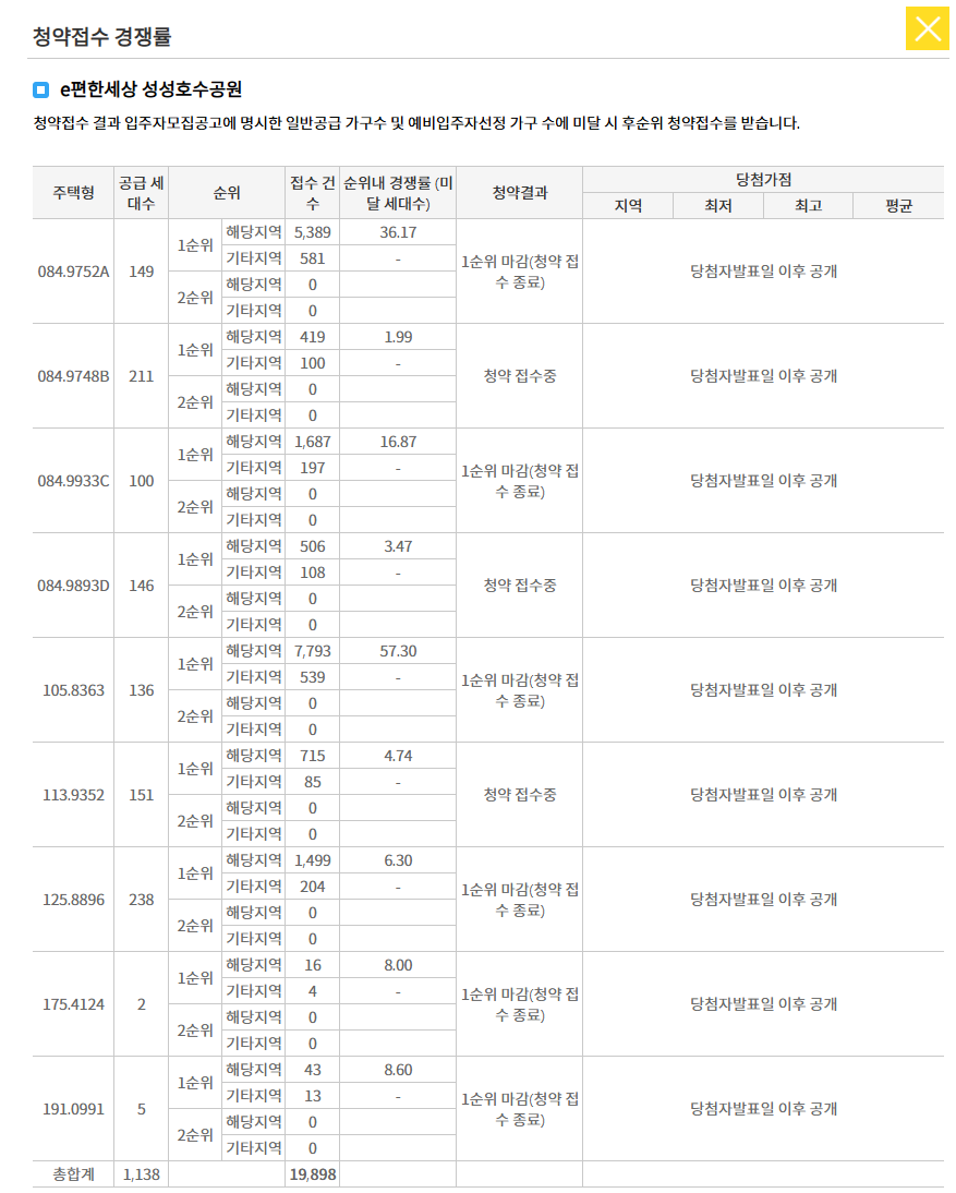 충남 천안시에 위치한 ‘e편한세상 성성호수공원’이 최근 1순위 청약에서 높은 경쟁률을 기록하며 관심을 끌고 있습니다. DL이앤씨가 선보인 이 대단지는 고급 주거 환경과 차별화된 특화 상품성 덕분에 많은 수요자를 모았는데요. 이번 청약에서 1만 9,898명이 청약을 접수하며, 평균 17.49대 1의 경쟁률을 기록했습니다. 그중에서도 전용 105㎡ 타입은 136가구 모집에 8,332명이 몰려 무려 61.26대 1의 최고 경쟁률을 기록하며 큰 관심을 받았습니다.
