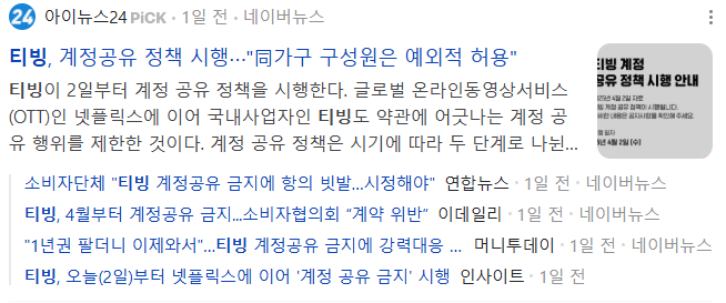 기사만 제목만 봐도 사람들의 불만이 엄청나요. 특히, 저렇게 1년권 팔고 이제와서 갑자기 금지하면 반칙이죠~넷플릭스에 이어 티빙도 계정 공유 제한을 도입합니다. 4월 2일부터 동일 가구 구성원 외에는 계정을 공유할 수 없도록 변경됩니다. 공유가 가능했던 것이 티빙의 매력이었는데 개인적으로는 불만이 되어버렸네요. 회사입장에서 보면 이게 불만이겠죠~ 이제 가족이 아닌 친구, 지인과 함께 사용하던 계정은 이용이 제한될 수 있으며, 동일 가구 내 기기가 아닐 경우 경고 메시지가 뜰 수 있다고 합니다. 넷플릭스도 계정 공유 제한 이후 신규 가입자가 증가했다고 하는데, 티빙도 비슷한 전략을 펼치는 것 같네요. 그동안 계정 공유로 저렴하게 이용하던 사람들에게는 아쉬운 소식이지만, 콘텐츠 제작사 입장에서는 불가피한 선택이었을 수도 있겠죠. 과연 티빙의 이번 정책이 어떤 영향을 미칠지 지켜봐야겠습니다.