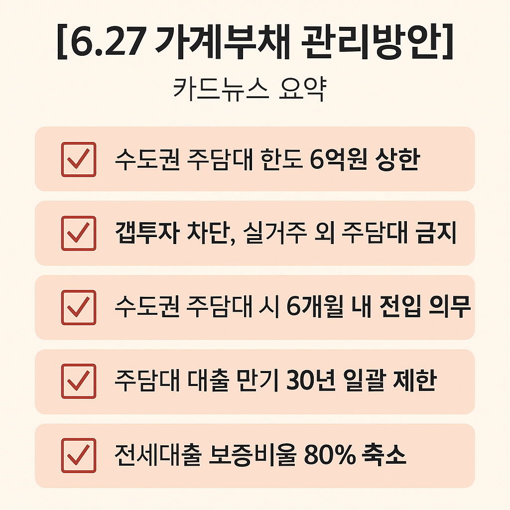 이 글은 2025년 6월 27일 발표된 정부의 가계부채 관리방안을 기반으로 작성된 분석 글입니다. 최신 부동산 정책 흐름을 누구보다 빠르게 알고 싶다면 ‘구독’과 ‘공감’ 부탁드립니다!