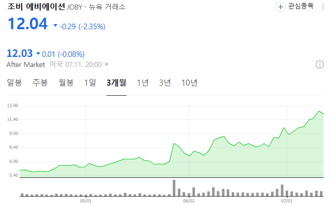조비 에비에이션 주가 UAM 관련주 Joby Aviation투자한지 며칠 안되서 사실 큰 수익이 나고 있다. 지금 12달러를 넘어섰는데 불과 한두달 전만해도 6달러 남짓이었다. 운좋게 싸게 잘잡았다. 하지만