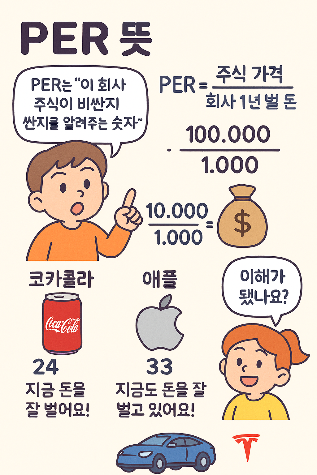 PER이란? "퍼"라고 읽고, "이 회사 주식이 비싼지 싼지를 알려주는 숫자"예요. PER는 영어로 Price to Earnings Ratio라고 하고, 한글로는 주가수익비율이라고 불러요.