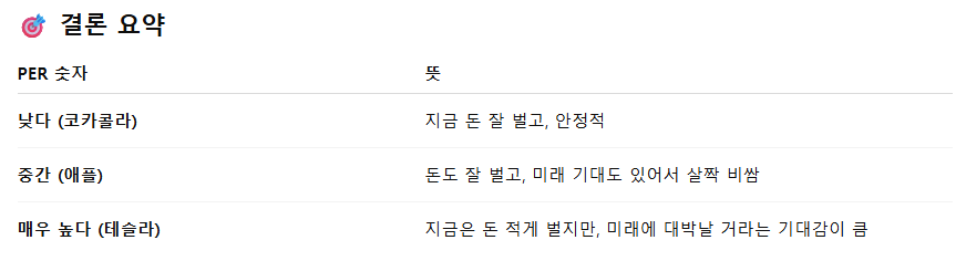 → 테슬라는 지금은 돈을 덜 벌지만, 미래에 잘될 거라서 PER가 높아요.