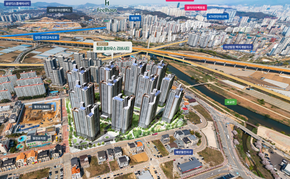 단지 인근에 초등학교 신설 예정으로 자녀가 있는 가정에 적합하며, 배방역과 KTX 천안아산역 모두 차량으로 접근 가능합니다. 월천지구는 이미 완성된 입지에 들어서다보니 입주와 동시에 주변 모든 상권을 누릴수 있다는 것이 큰 장점입니다.