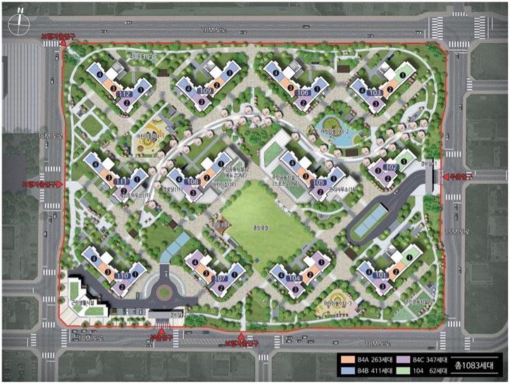 총 1,083세대 규모의 대단지는 커뮤니티 시설이 잘 갖춰질 가능성이 높으며, 대규모 관리 체계로 관리비 절감 효과를 기대할 수 있습니다. 게다가 주차대수가 1.4대 1로 보통의 아파트 1.2대와는 사뭇 다른 느낌의 주차 공간을 느낄 수 있을 겁니다.
