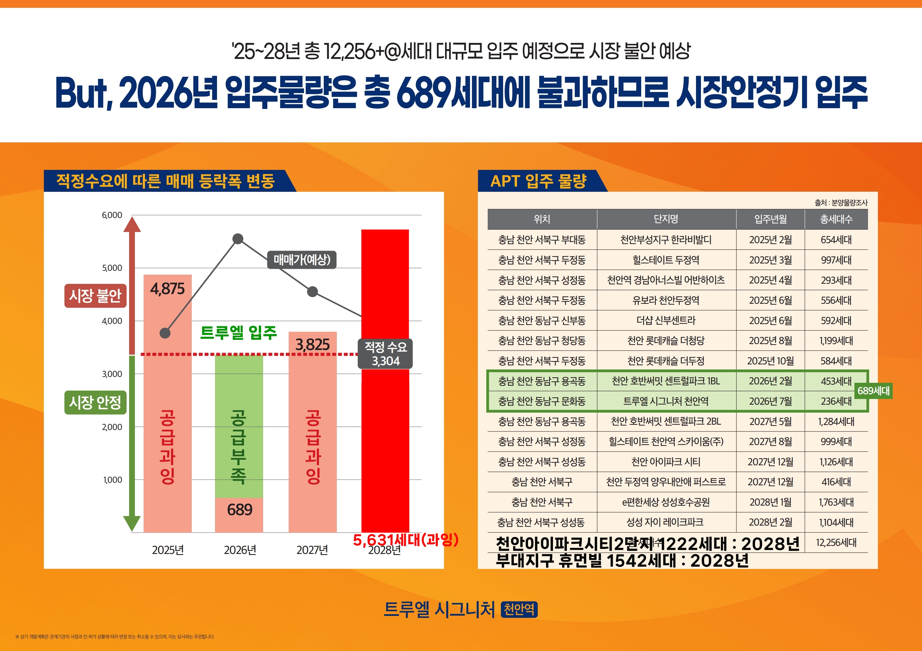 천안역 트루엘 시그니처 2026년 입주 예정입니다. 해당 연도 천안시 전체 입주 예정 물량은 트루엘 시그니처 천안역 아파트 포함 700세대도 되지 않아, 공급 부족에 따른 희소성이 예상됩니다. 이는 곧 입주 시점의 자산가치 안정성과 상승 가능성을 동시에 의미합니다. 분양권 매도는 물론 전세 혹은 월세를 맞출 때 엄청난 메리트로 작용하게 됩니다. 부동산 시장은 타이밍과 조건이 맞아야 합니다. 현재의 중도금무이자, 할인분양 가격 메리트, GTX-C 천안역 호재, 비규제 입지, 그리고 파격 분양 조건까지, 이런 조합은 쉽게 다시 오지 않습니다. 별도 문의주시면 상세히 안내드리겠습니다.
