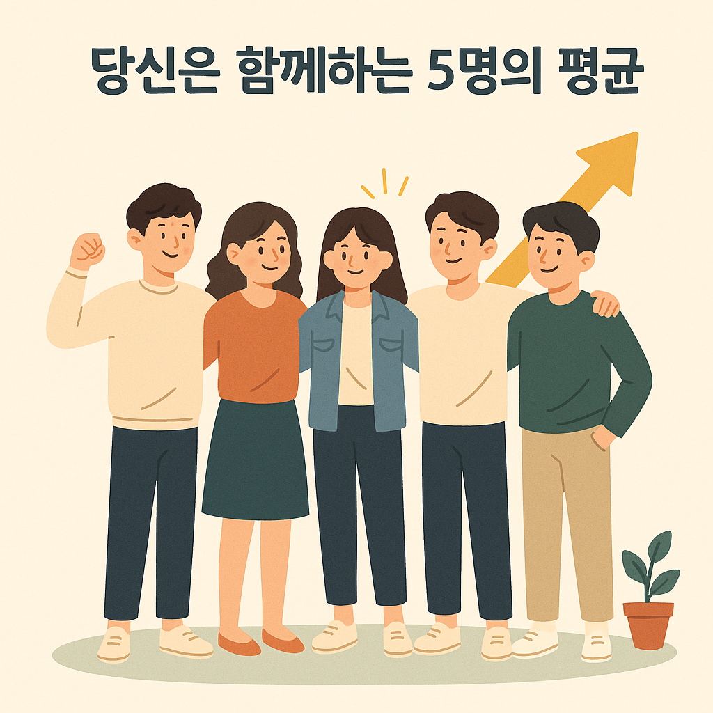 그렇다면 나와 가장 많은 시간을 보내는 다섯 명은 누구일까요? 친구일 수도 있고, 직장 동료일 수도 있으며, 심지어 유튜브나 책에서 자주 보는 인물일 수도 있습니다. 요즘은 직접 만나지 않아도 온라인에서 어떤 사람의 생각과 가치를 꾸준히 접한다면, 그 역시 내 삶에 영향을 줍니다. 만약 다섯 명 중에 부정적인 사람이 많다면, 내 삶에도 그런 기운이 퍼질 수밖에 없습니다. 반대로 노력하고, 배우고, 서로 응원해 주는 사람들이 곁에 있다면, 나는 매일 조금씩 더 나아질 수 있습니다.