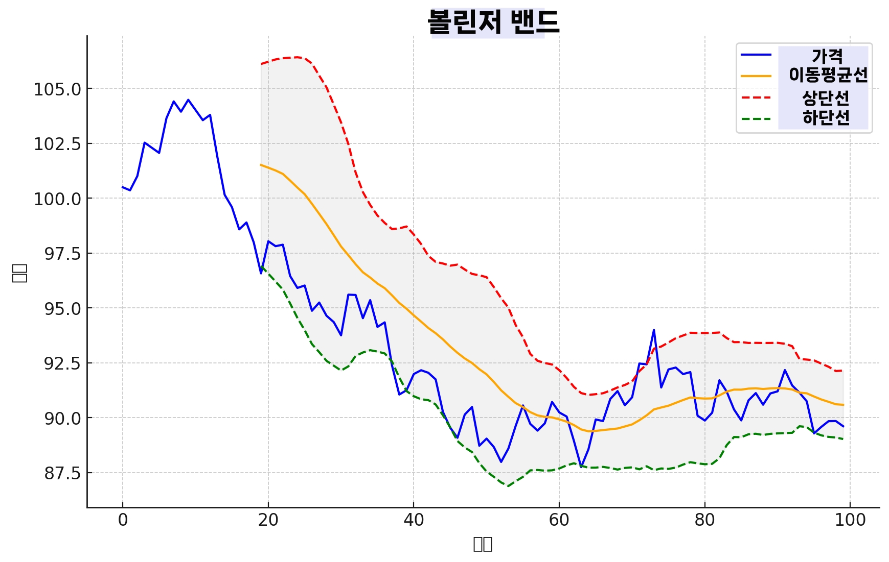예를 들어, 주가가 위쪽 선(상단 밴드)에 닿으면 보통 과열 상태, 즉 너무 많이 오른 상태일 수 있습니다. 반대로 아래쪽 선(하단 밴드)에 닿으면 시장에서 저평가되었을 가능성이 있다는 신호가 됩니다. 그래서 투자자들은 볼린저 밴드를 이용해 매수와 매도 시점을 판단하려고 합니다. 볼린저 밴드는 어렵게 들릴 수 있지만, 실제로는 가격의 움직임을 시각적으로 보여주는 단순한 도구라고 이해하면 됩니다.