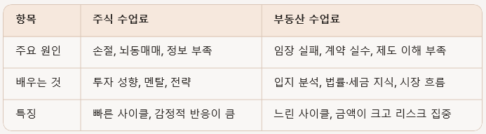 투자 세계에서 말하는 "수업료"는 단순한 비용이 아니라, 실전 경험을 통해 배우는 대가를 의미합니다. 주식이든 부동산이든, 처음 시작할 때 겪는 손실이나 시행착오를 통해 얻는 교훈을 ‘수업료를 냈다’고 표현하죠.