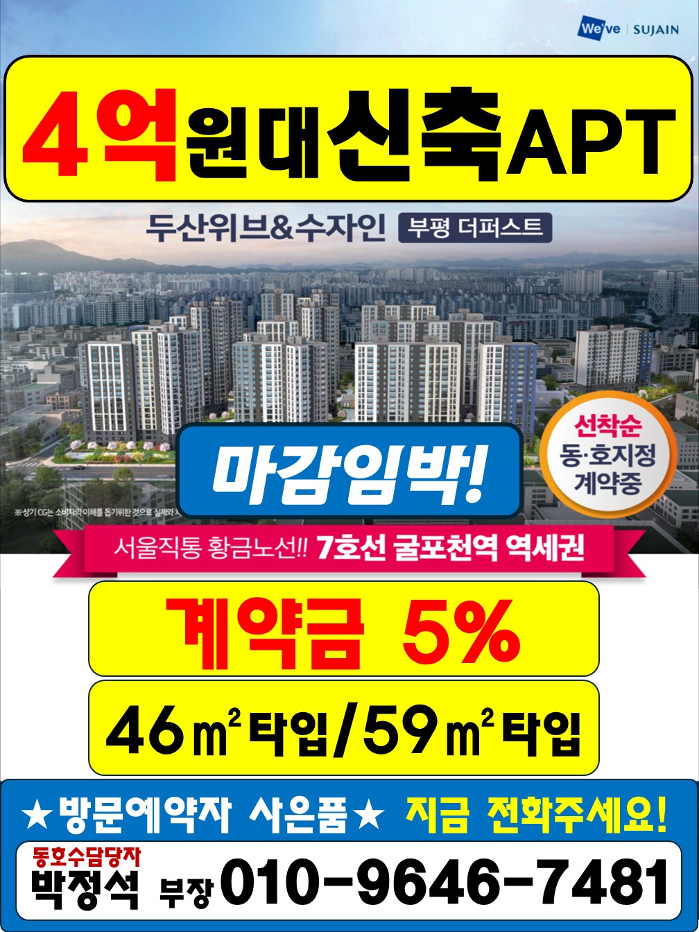 현재 부개 두산위브 수자인은 폭발적인 관심 속에 전 타입이 빠르게 소진되며 마감 직전입니다 . 59타입은 문의 쇄도로 일부 잔여 세대만 남았으며, 특히 합리적인 분양가로 역세권 아파트를 마련하려는 1~3인 가구 및 신혼부부에게 충분한 공간을 제공하는 46타입이 뜨거운 인기를 얻고 있습니다. 46타입은 실속형 평면의 강점을 살려 공간 활용도를 극대화했으며, 현재 로얄 동호수 마감이 임박했습니다.