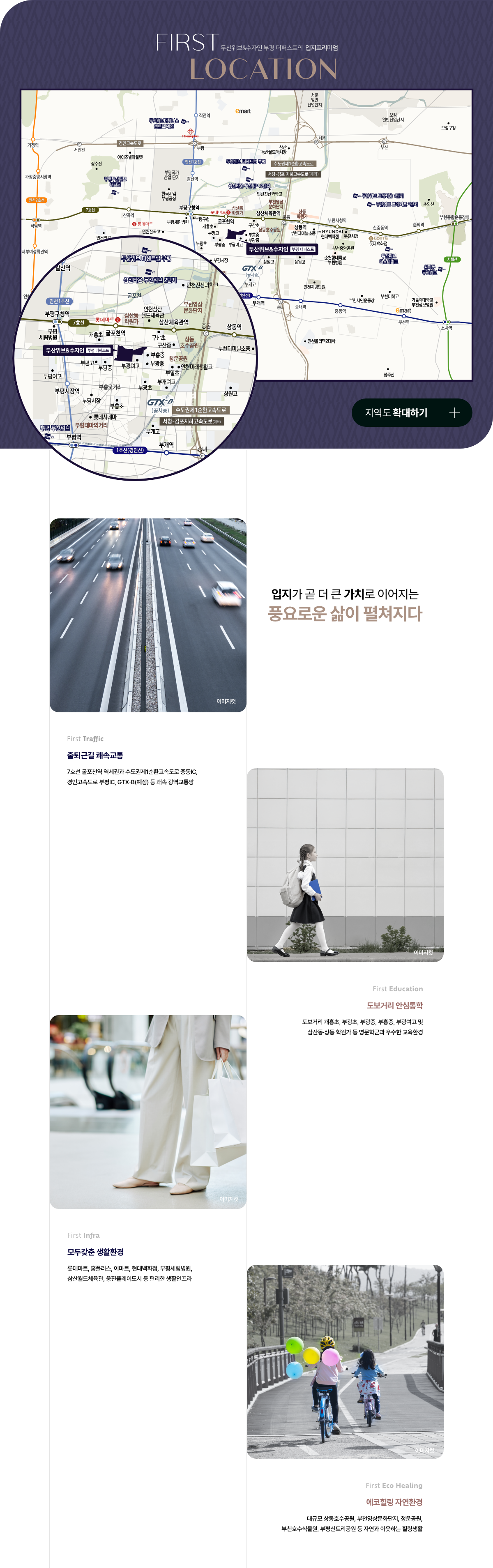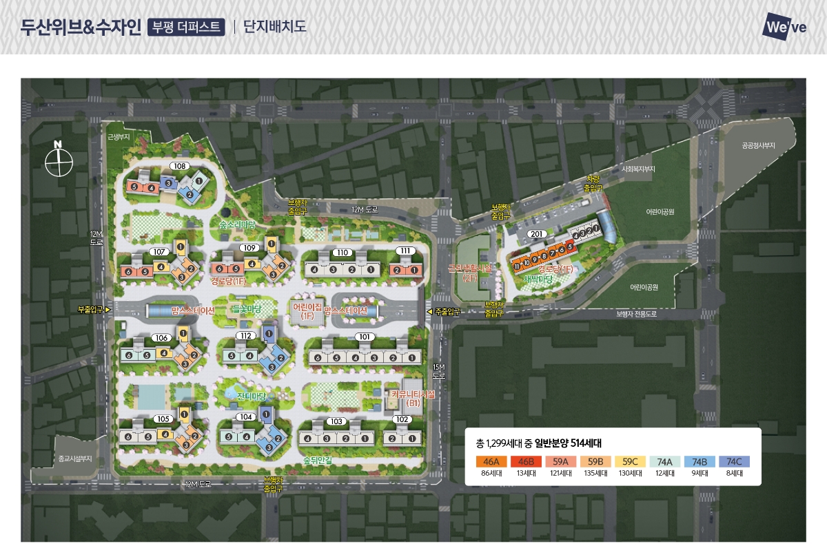 1,299세대 대단지 입주민들은 입주와 동시에 이미 완성된 부평의 풍부한 생활 인프라를 그대로 이용 가능합니다. 롯데마트, 현대백화점 등 대형 쇼핑 시설과 행정복지센터, 구청 등 관공서 시설이 밀집해 있어 편리한 원스톱 생활을 누릴 수 있습니다. 또한 대학병원 등 의료 시설 및 재래시장 이용도 용이하여 정주 여건이 매우 우수한 두산위브앤수자인 부평 더퍼스트