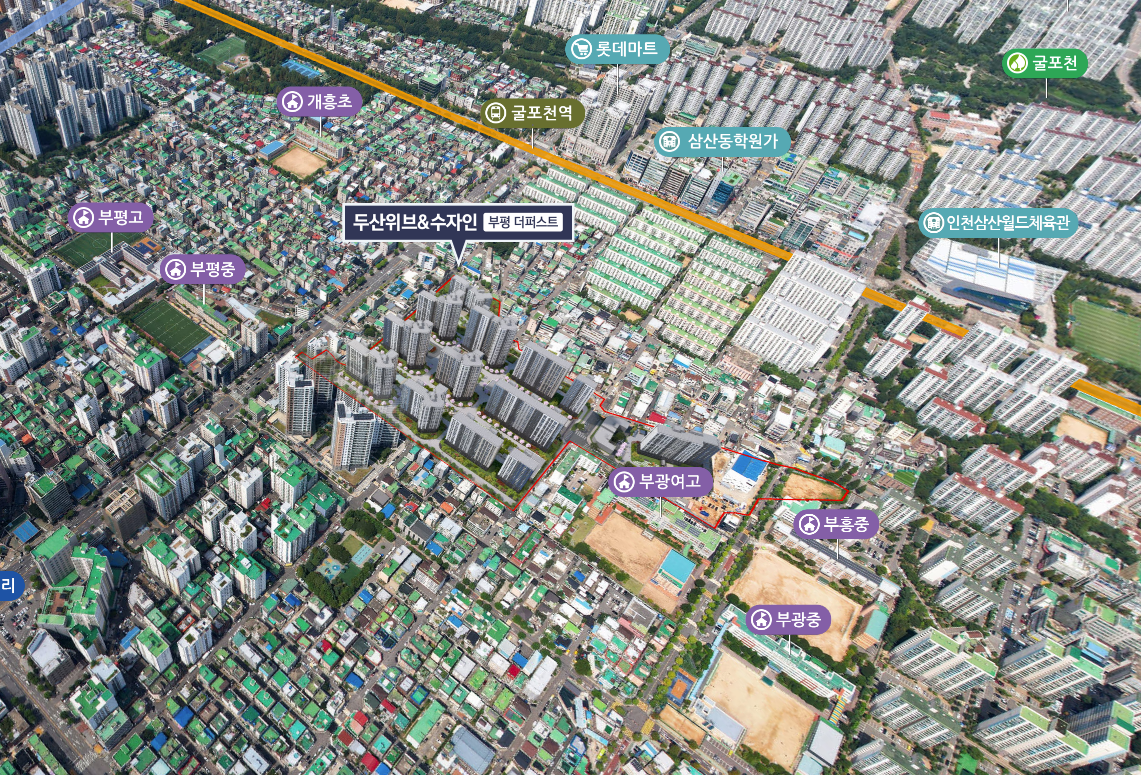 자녀를 둔 학부모에게 중요한 우수한 학군 또한 부개 두산위브 수자인의 강점입니다. 단지 인근에 초·중·고교가 모두 도보 통학 거리에 위치하여 안심하고 자녀를 통학시킬 수 있습니다. 특히 지역 내 교육열이 높은 부천 삼산동 학원가를 이용하기 좋은 접근성을 갖추고 있어, 공교육과 사교육을 아우르는 명문 학세권 입지를 완성하는 두산위브앤수자인 부평 더퍼스트 아파트.
