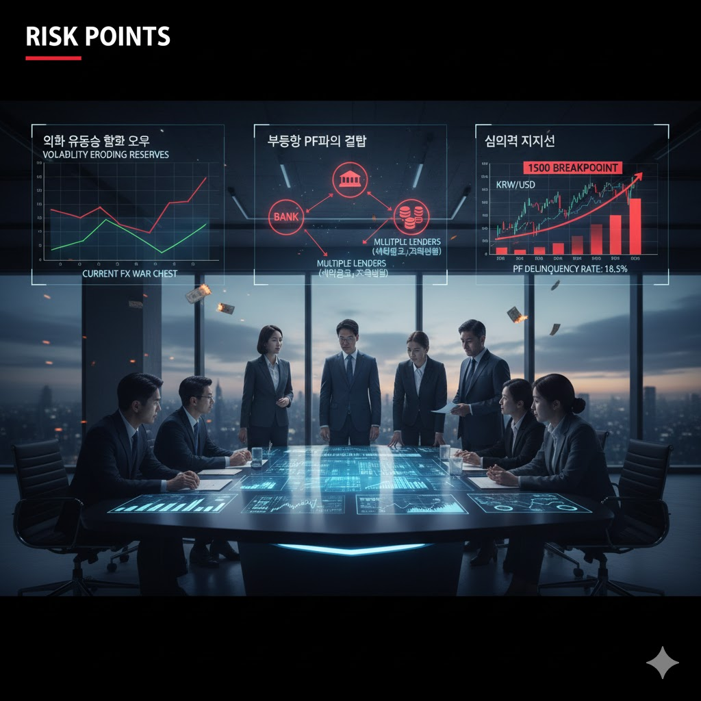 - 부동산 PF와의 결합: 현재 국내 금융권의 가장 큰 약점은 부동산 PF(프로젝트 파이낸싱)입니다. 환율 변동으로 인해 금리 환경이 불투명해지면, PF 대출 연체율이 상승하며 2금융권(새마을금고, 저축은행 등)부터 타격을 입을 수 있습니다.