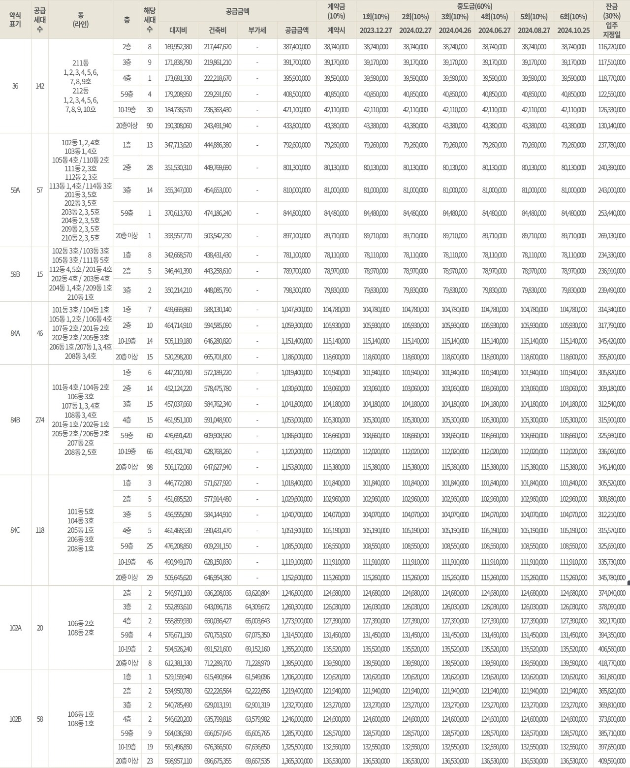 평형만 봤을 때는 오피스텔과 비슷한 면적이다보니 4억원 내외에서 매수 가능한 상태이니 아파트로 갈 수 있다는 것이 더 좋은 선택지라고 볼 수 있겠습니다. 물론 향후 입주 초기에 전세를 맞추려는 투자자의 경우에는 조심스럽게 접근해야 하겠죠. 세대수가 큰 메머드급 단지이다 보니 초반 전세가격은 저렴하게 맞추어지는 것이 일반적이기 때문입니다. 자세한 분양가는 아래 이미지로 확인하시고, 누르면 크게 확대 해서 보실수 있습니다.입주자 모집공고가 발표된 이후 발코니 확장비가 무상으로 이목을 끌었지만 분양가를 살펴보면 확장비가 녹아져 있구나 라는 것을 알 수 있습니다. 59타입의 경우 7억원대 중후반 ~ 8억원을 훌쩍넘는 분양가도 있습니다. 84타입의 경우 10억원에서 11억원으로 12억원 이하에 형성되어 있고, 102타입의 경우 12억 ~ 14억원 이하로 책정 되어 있습니다.