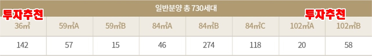 투자자 역시 84타입은 현실적으로 당첨 될 확률이 어렵기 때문에 상대적으로 59타입을 추천해볼 수 있겠습니다. 물론 중형평형인 84타입 ABC타입이 인기는 많겠지만 청약이라는 것은 당첨이 관건이라고 볼 수 있습니다. 당첨 전략으로 간다면 36타입도 추천 해볼만 합니다. 이렇게 소형 면적의 경우에는 1인이 거주하는 수요가 굉장히 많은데 혼자 살더라도 세대수 규모가 큰 아파트에서 누릴수 있는 커뮤니티 등 다양한 시설을 누릴수 있기 때문에 이런 곳을 선택하는 경우도 주변에서 많이 찾아 볼 수 있습니다.