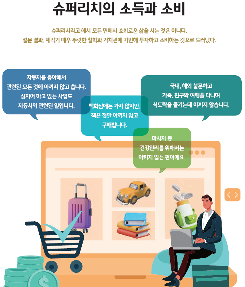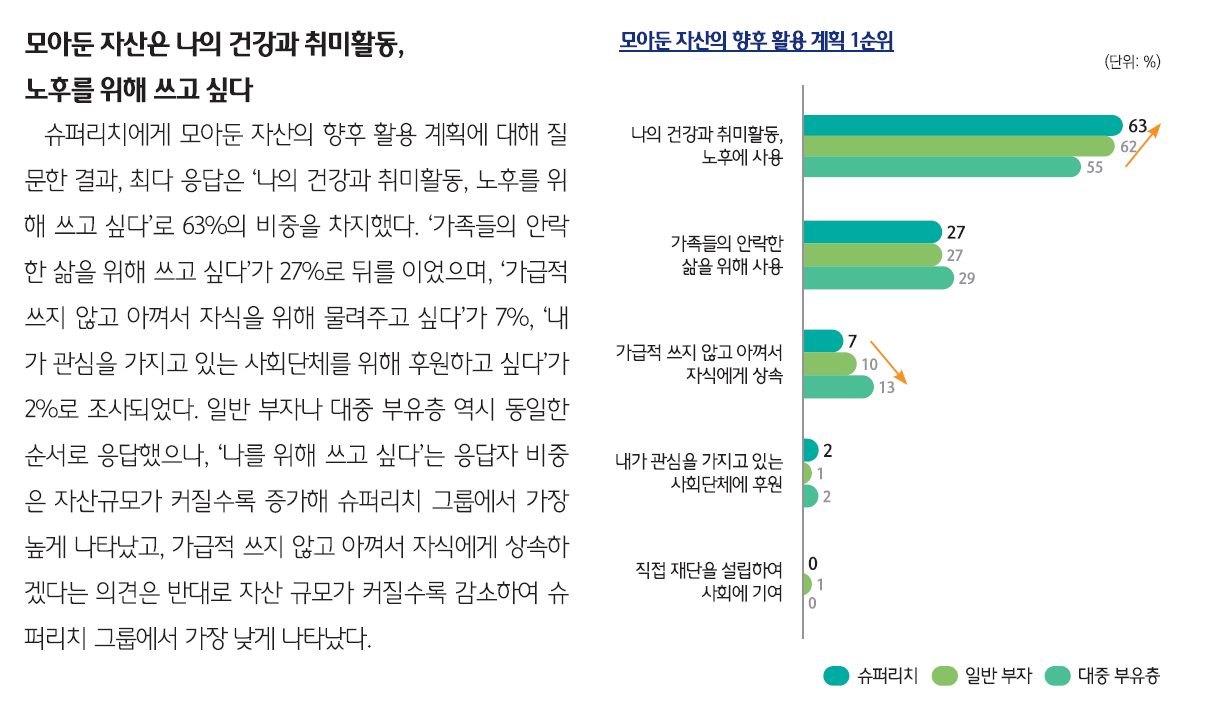 슈퍼리치의 자산관리 어떻게 슈퍼리치가 되었을까? 슈퍼리치의 소득과 소비, 슈퍼리치의 부 이전계획에 대해 알아보겠습니다. 슈퍼리치라고 해서 모든 면에서 호화로운 삶을 사는 것은 아니라고 합니다. 설문 결과, 사람마다 달랐지만 제각기 매우 뚜렷한 철학과 가치관을 기반으로 투자하고 소비를 하는 것으로 알려졌습니다. 예를들면 "자동차를 좋아해서 관련된 모든 것에 아끼지 않고 쓰는데 심지어 하고 있는 사업이 자동차와 관련된 일이다", "백화점은 가지 않아도 책은 정말 아끼지 않고, 구매를 한다", 가족이나 친구들과 여행을 다니며 식도락을 즐기는데 아끼지 않는다", "마사지 등 건강 관리를 위해 아끼지 않는다" 등의 의견이었습니다. 이렇게 모아둔 자산은 건강과 취미활동, 노후를 위해 쓰고 싶다고 말한 응답이 무려 63% 비중을 차지했습니다. 이렇게 "나를 위해 쓰고 싶다" 라는 응답의 비율이 커지는 것은 자산규모가 커질수록 증가하는 것과 비례하였습니다. 반대로 자식들에게 상속을 하겠다는 응답은 자산규모가 작을수록 높게 나타났습니다. 보다 자세한내용은 아래로 이동해보겠습니다. 클릭하면 크게 보입니다.