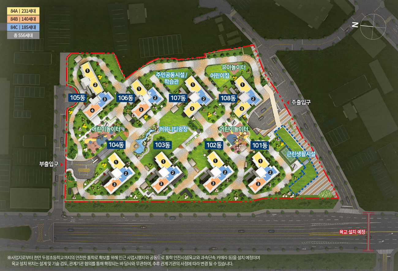 천안 두정역 윺보 총 556세대 전용84㎡단일타입으로 84a타입, 84b타입, 84c타입 3개의 평면으로 나왔습니다. 동별배치도는 105동~108동부의경우 단지안쪽이지만 두정이편한세상4차와 두정역 범양레우스을 바라보고있는쪽이고요. 101동~104동은 두정역쪽라인으로 단지외부와 시티조망권이 나오는 라인입니다.