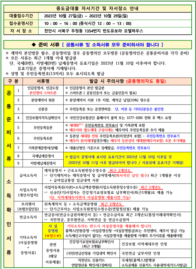 두정역 반도유보라 중도금대출서류접수기간이 나왔네요.10월27일~10월29일까지이니 참고하세요. 중도금대출서류접수의경우 미리 사전에 방문예약후 예약시간에 서류접수를 해야한다고 하니 미리 사전예약 하시구요. 서류접수기간과