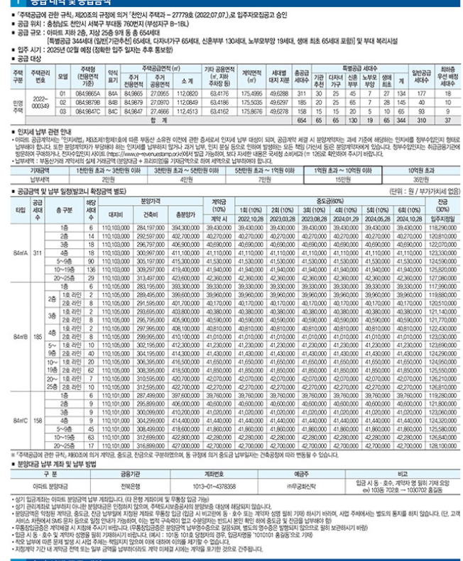 *세대수 총 654세대 / 총 9개동 2025년2월 입주예정입니다. 평형 및 타입은 전용84㎡ 34평형으로 배치되어 있고 타입은 84A타입, 84B타입, 84C타입으로 3가지 타입입니다.