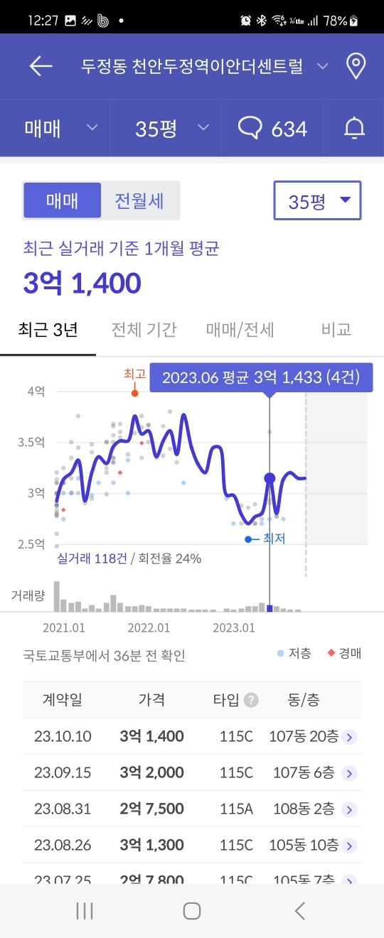 23년 6월이후~최근거래가 8월이네요. 거래시세 3억2천~3억7천대 거래가 이루어졌고요. 11월 현매물시세는 3억5천대로