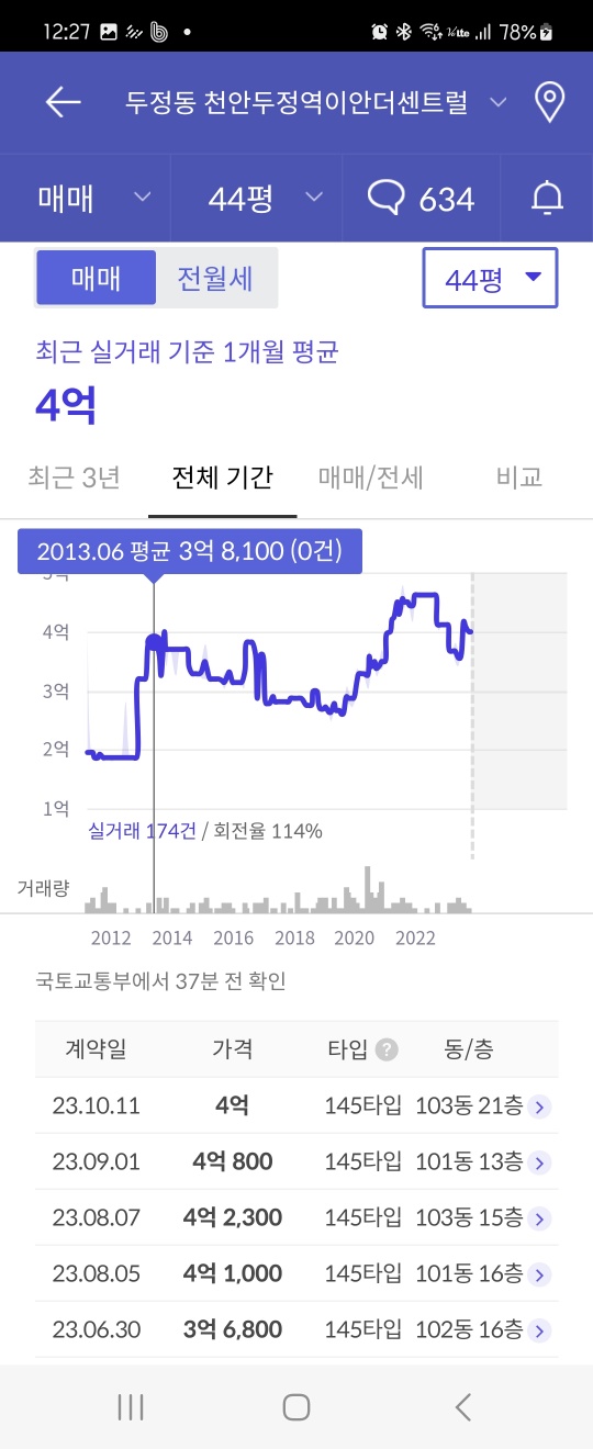 최근 실거래 내역을 살펴보면, 최근 10월 4억 거래가 있었습니다. 대형평형의경우 실수요율이 높은편이기때문에