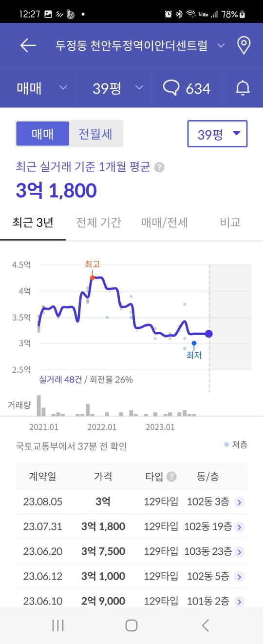 두정역 이안더센트럴의 최근 실거래가격과 평형대별 시세 자료를 살펴보겠습니다.