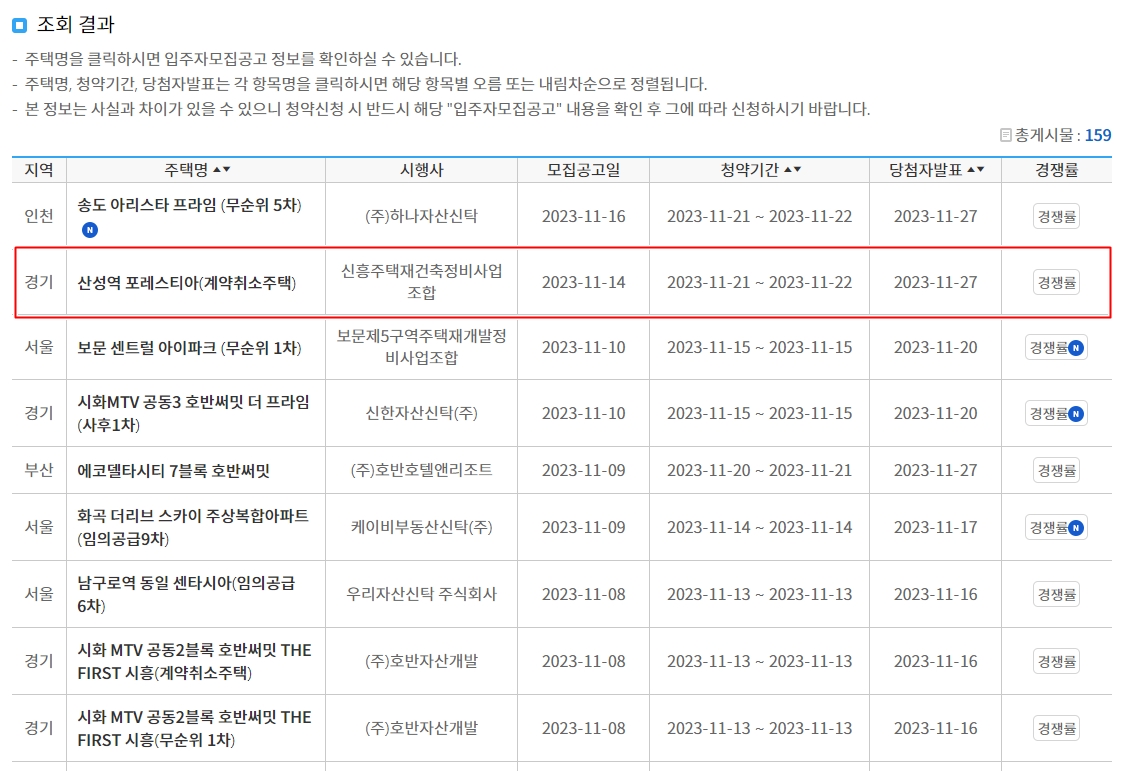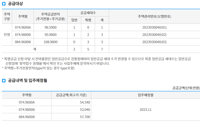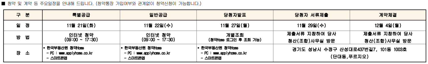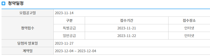 청약홈에는 위와 같이 청약 일정이 나와있습니다. 우리는 11월 21일 특별공급과 22일 일반공급에만 집중 하시면 됩니다. 입주자모집공고문은 청약홈을 참고하세요