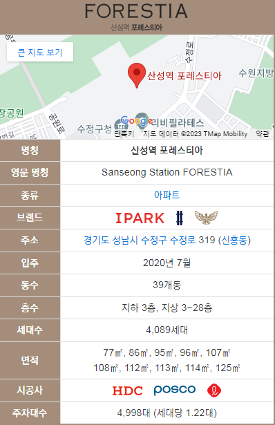 참고로 산성역 포레스티아 아파트는 현대산업개발, 포스코건설, 롯데캐슬 이렇게 3개 시공사에서 컨소시엄으로 멋지게 만들었습니다. 각 동별로 시공사가 다릅니다.