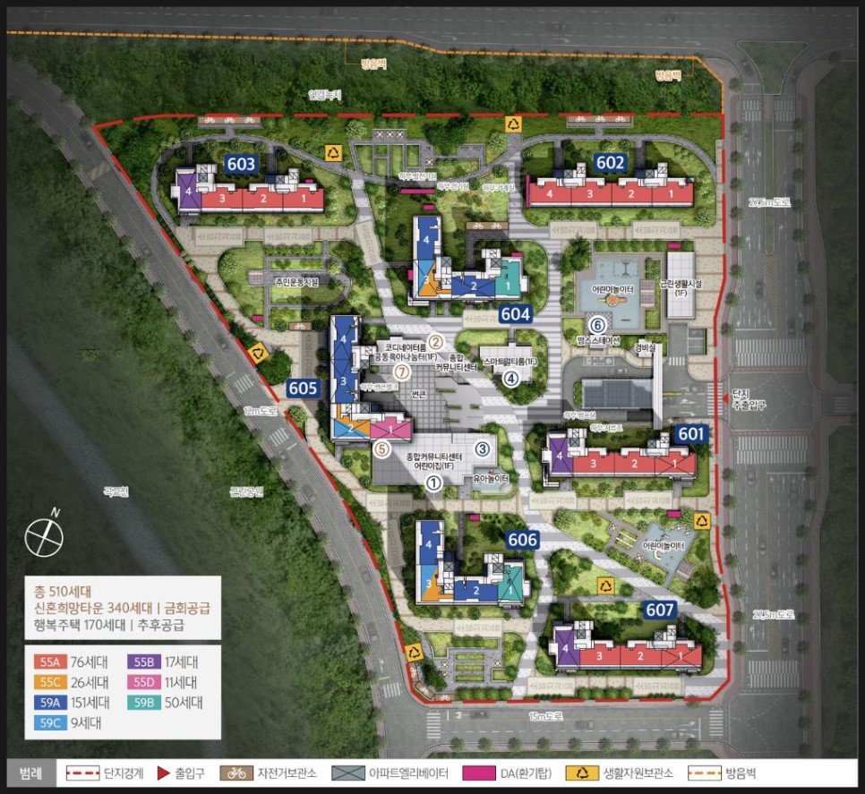 단지배치표입니다. 별하신도시 하늘채의경우 저층부는 1층2층세대도 있지만 높은층고인 필로티라인 3층4층대